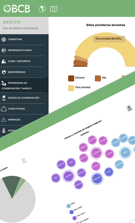 para conocer la biodiversidad en las áreas protegidas y otras unidades geográficas como las ecorregiones, cuencas y estados. También se puede consultar el estado de conservación, las tendencias de cambio y amenazas en los ecosistemas, así como la diversidad de ambientes y culturas en las distintas unidades geográficas, entre otros aspectos relevantes para su manejo.